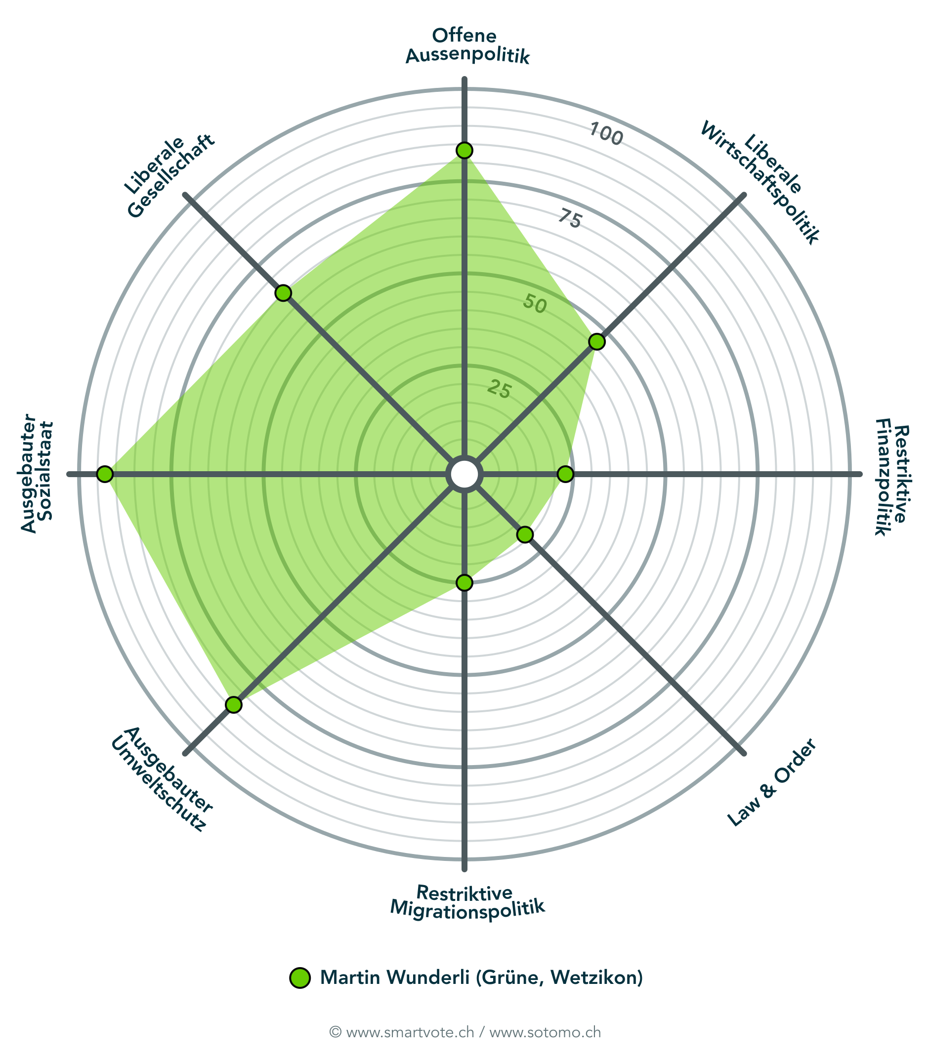 Die "Smartspider" von Smartvote widerspiegelt deutlich meine ökologisch-soziale Grundhaltung. Ich setze mich für eine liberale Gesellschaft ein und befürworte eine offene Aussenpolitik. Die "Smartspider" beruht auf einem Fragebogen anlässlich der Kantonsratswahlen 2023.