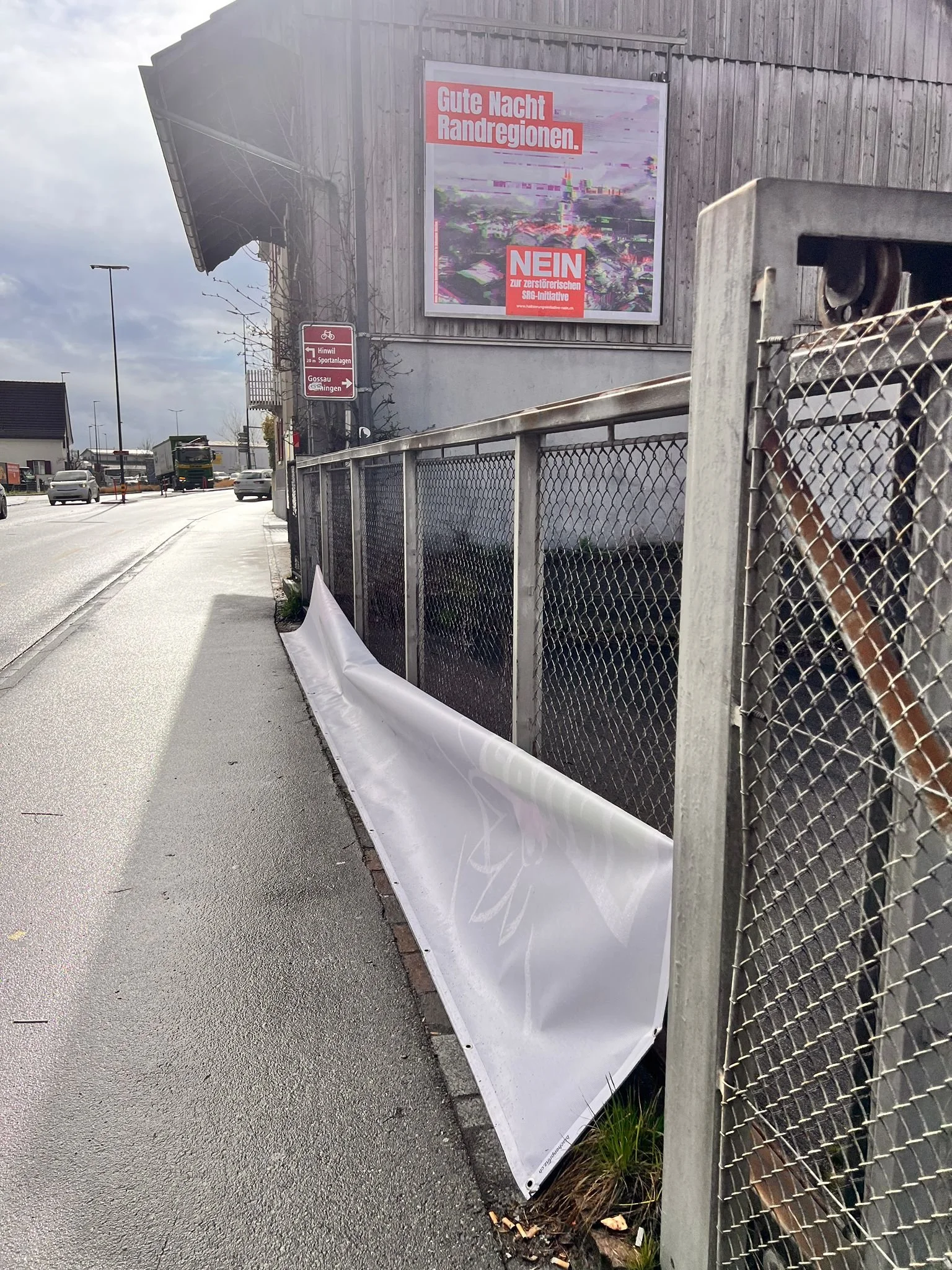 Werbebanner an der Rapperswilerstrasse 22 in Wetzikon wurde am 14. März 2026 mutwillig weggeschnitten und später ganz gestohlen.